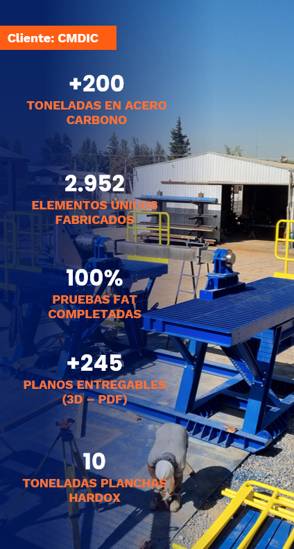 • Pruebas FAT en taller (prueba funcional motorizada, chequeó eléctrico, control de alineamiento de tambor, balanceo dinámico de tambor a baja velocidad, verificación dimensional)